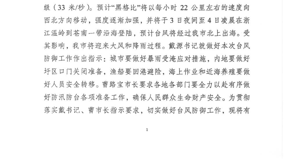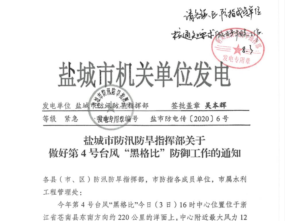 盐城市防汛防旱指挥部关于做好第4号台风“黑格比”防御工作的通知