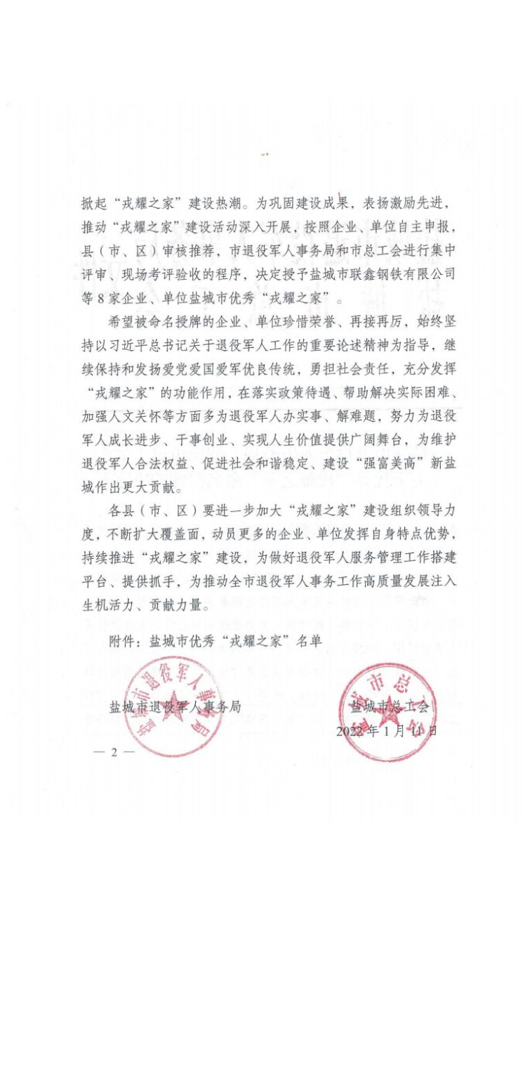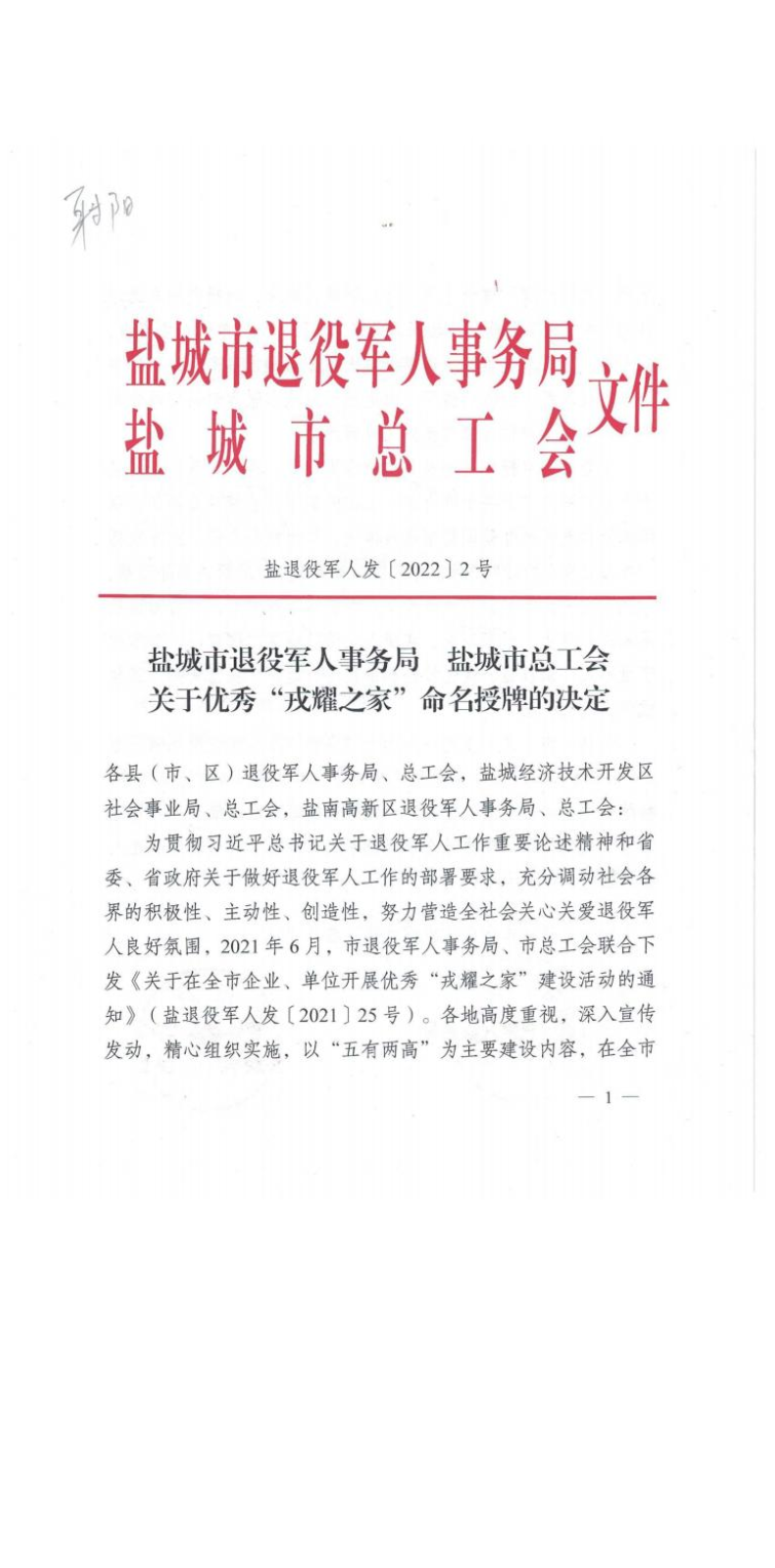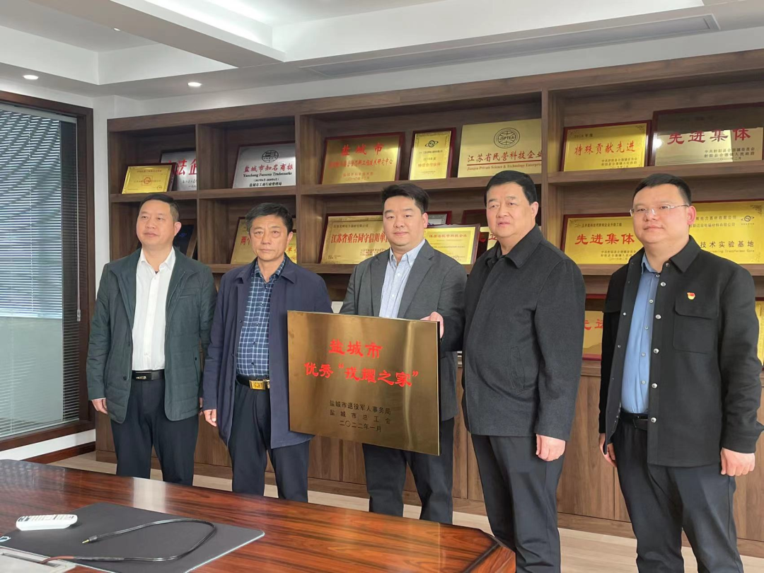 日前,盐城市退役军人事务局对全市8家优秀“戎耀之家”命名授牌。射阳县合德镇园区企业江苏光辉电力器材有限公司是盐城市唯一一个民营企业组织受到命名表彰。受市局委托县退役军人局长胡志海、副局长沈健为该公司送达了奖牌,镇人武部长陈随园陪同。